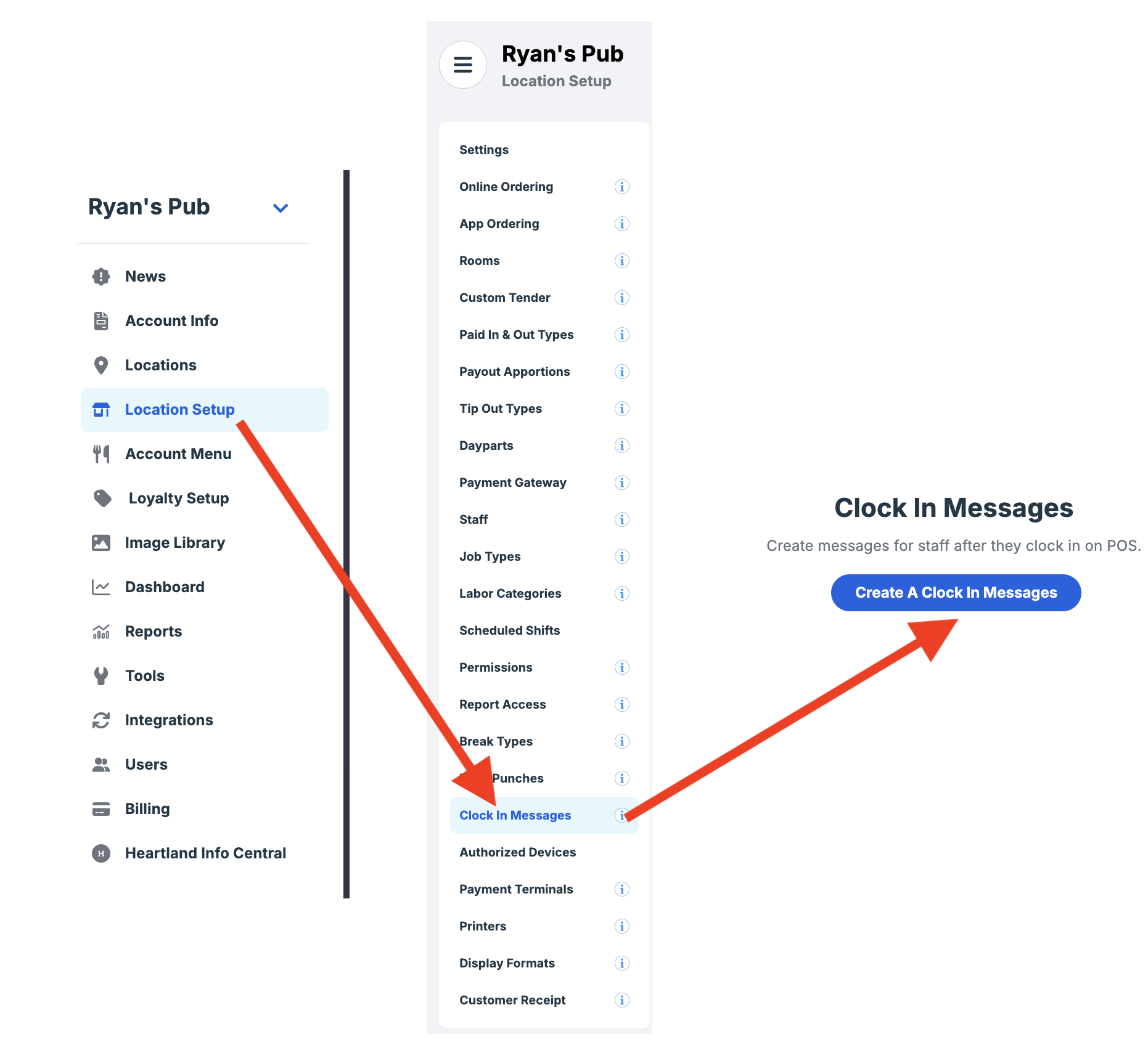 To access the Clock-In Messages screen, log into the Admin Console, select an appropriate account and location. In the Admin Console’s Main Menu, click Location Setup, then click Clock In Messages.