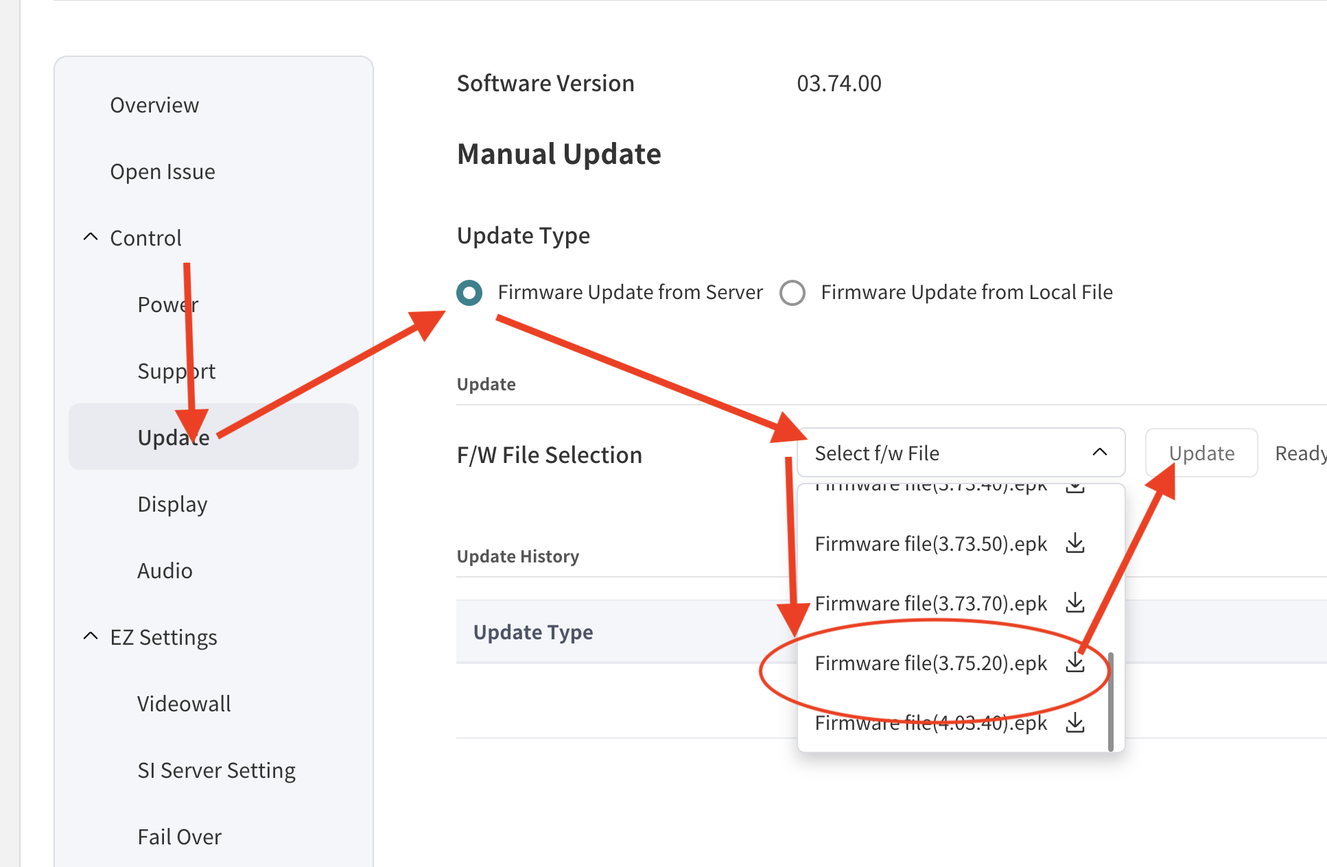 Navigate to Control > Update